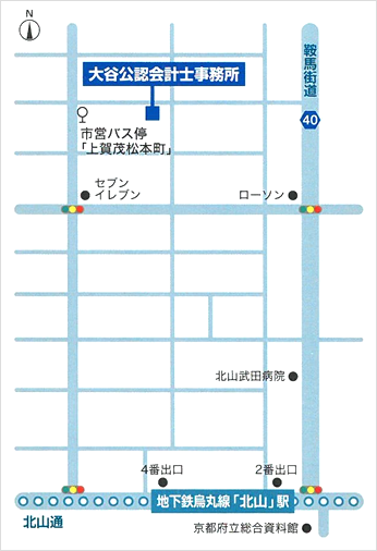 ●京都駅から京都市営地下鉄烏丸線で国際会館行きに乗車、「北山」駅下車。徒歩9分